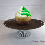 A green and white frosted cupcake sitting on a dark metal cake stand on a white background by Champagne and Sugarplums