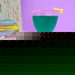A teal cocktail with a pink sugared rim in a Nick and Nora glass on a white and purple background by Champagne and Sugarplums